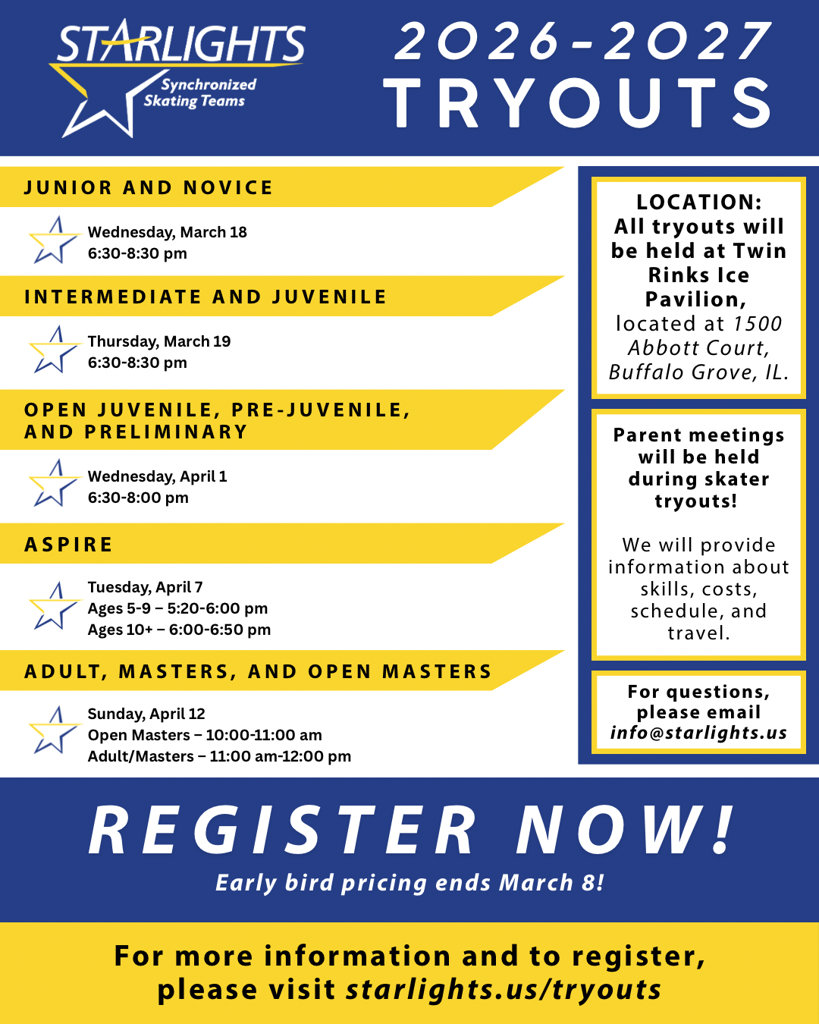 Starlights tryout registration is OPEN! Come for the skating, and stay for the team bonding, the growth, the friends, fun and community, and see the magic that happens when we do it together!